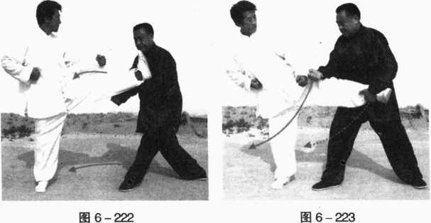 肘为导向涌身横铲使对方后跌(图6-220、图6-221)。