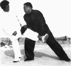 挑进入中门从对方臂里向下进入侧门则由对方臂上向下插挑左手控制上肢后脚上步控制下肢右臂涌靠(图6-222、图6-223、图6-224)。