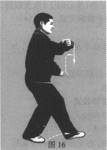 带动左脚提起,前掌 略向左撇,在右脚前 半步处落地,与此同 时,带动左掌向右划 弧至右肩前,再带回 胸前(左掌转握拳、 拳眼向上、拳心向 里)。(图16)