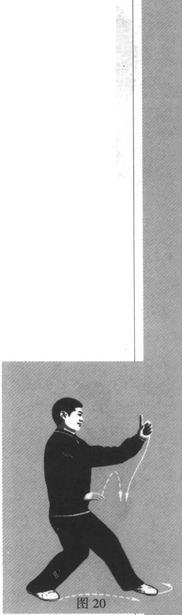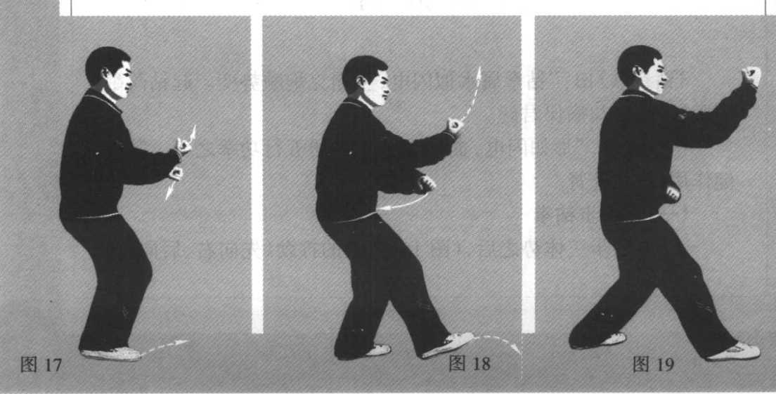1. 左顺步三体势之后,(图15)以腰的拧劲(先向右、后向左)