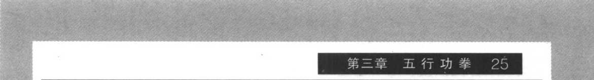 4. 在右脚落地成右三体势步的一刹那,右拳自下而上向前 钻打(拳面向上、拳心向里、肘部微屈),与此同时,左拳按至腹前 (拳心向下),拇指根节一侧紧靠神阙穴。至此,右顺步钻拳完成。 (图 19)