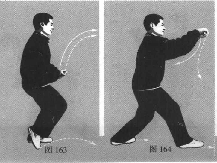 3. 右脚向前略偏右迈出的同时,两拳并拢 上提至胸前(拳心转向下),在右脚落地成右三 体势步的一刹那,两拳以双马拳并排向前崩击 (拳面向前、拳眼相对、两腕绷起)。(图164)