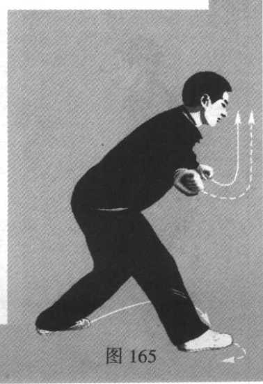 4. 右脚上半步,左脚跟进半步助力,与此 同时,两拳变掌(掌心向前),两掌边下按边握拳 并迅即向两侧按拽,以头向前撞击。(图165)