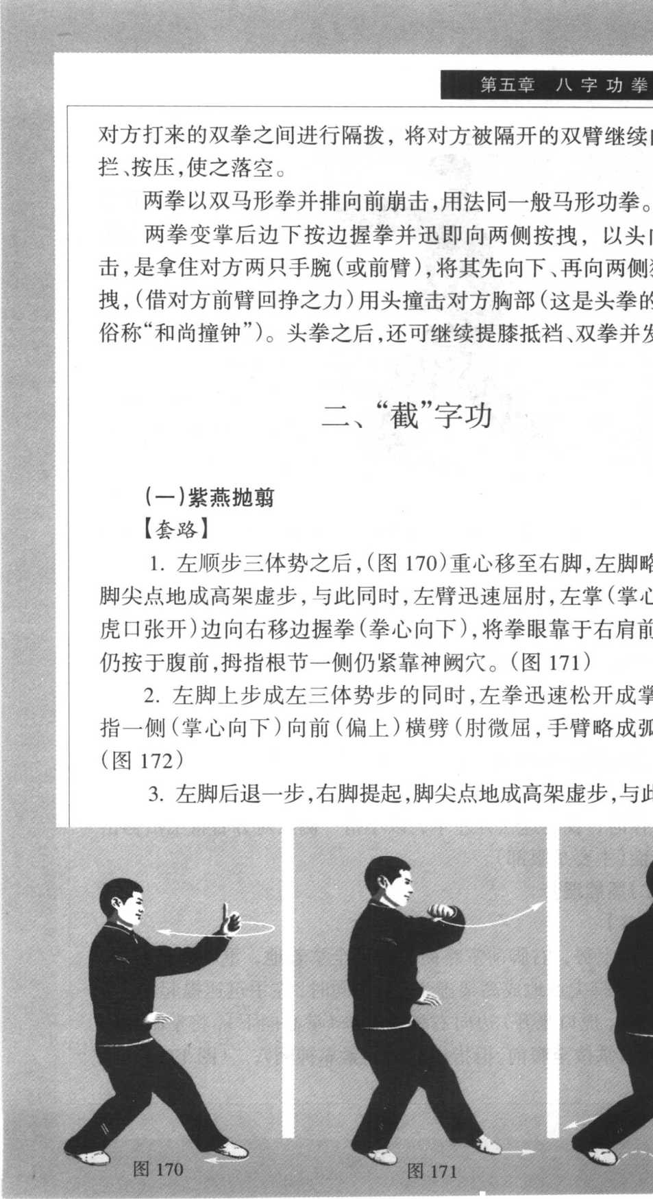 8. 左脚上半步,右脚跟进半步助力,与此同时,两拳变掌(掌 心向前),两掌边下按边握拳并迅即向两侧按拽,以头向前撞击。 (图 169)