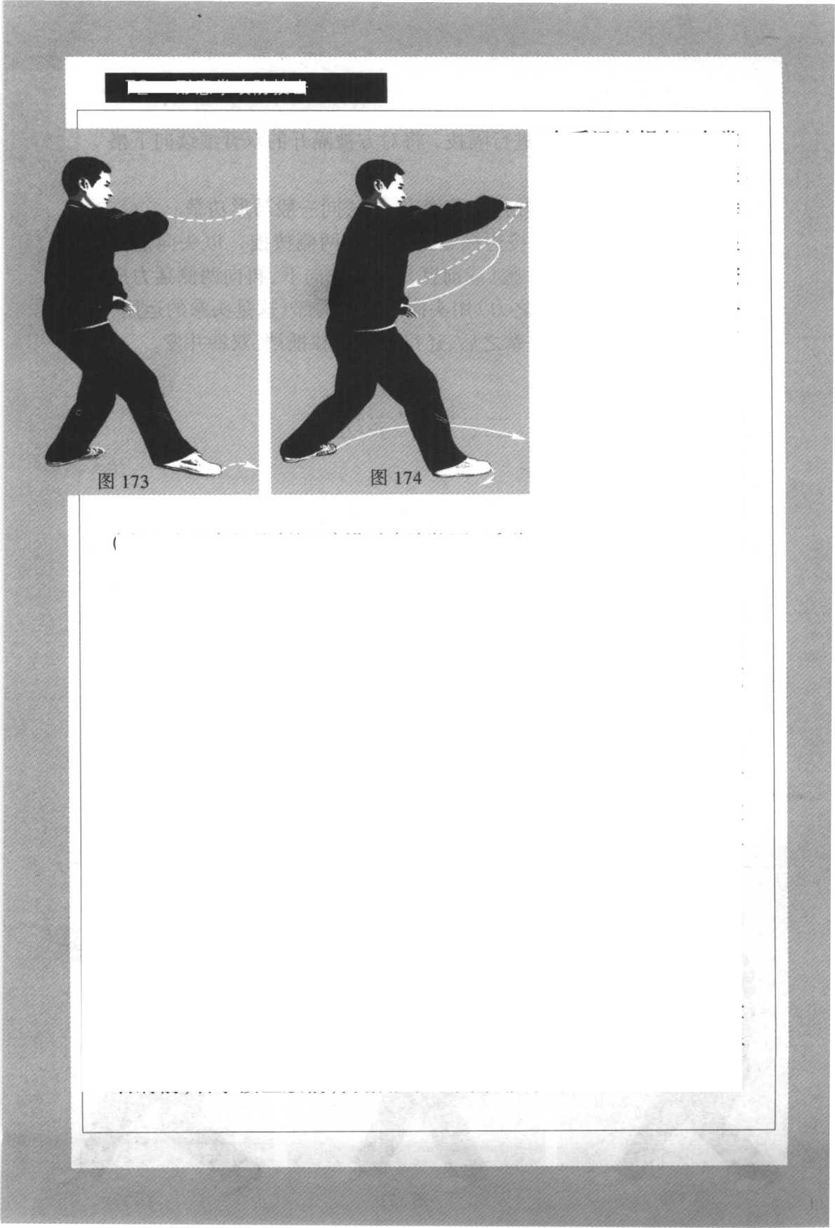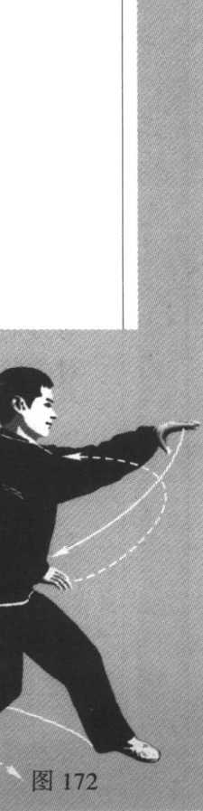 4. 右脚上步成 右三体势步的同 时,右拳迅速松开 成掌,以小指一侧 (掌心向下)向前(偏上)横劈(肘微屈,手臂略成弧形)。(图174) 【动作要点】