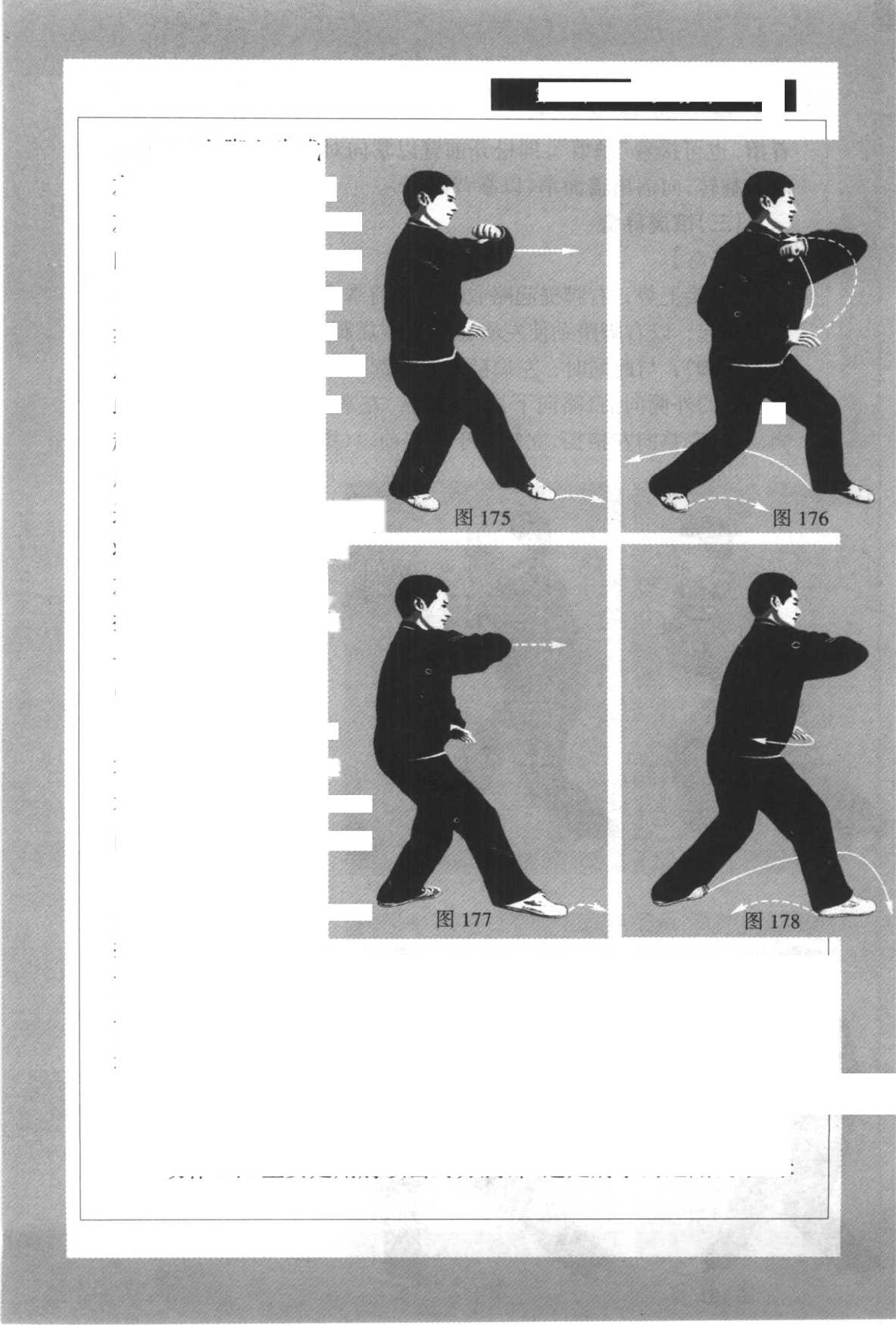 4. 右脚上步成¥ 右三体势步的同时,身 右臂仍屈肘,以右肘 向前顶击。(图178)