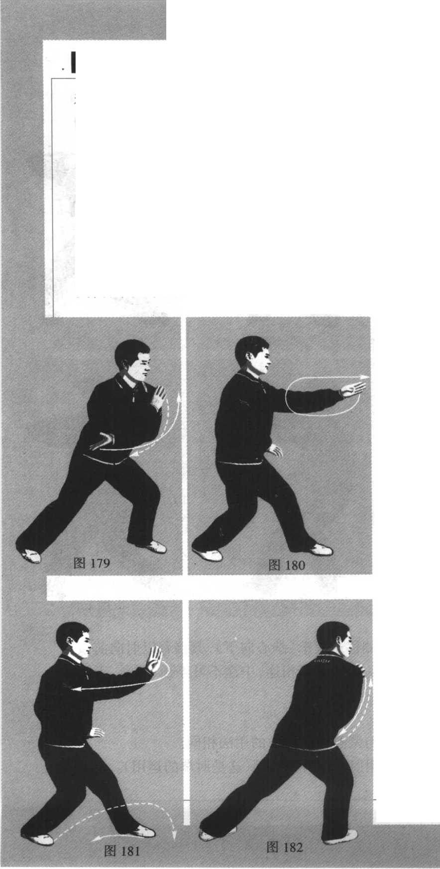 (略向下)猛力撞靠, 右掌(掌心向上)插 向腰左侧;左掌自左 向右格挡,立掌护于 右肩前。(图182)