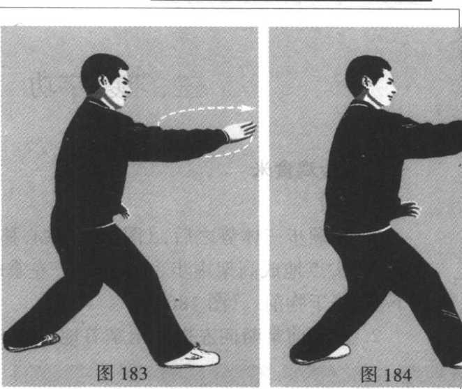 右掌收回胸前,随即向前出劈拳(掌)。(图184)