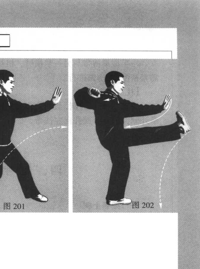 6. 右腿提膝上顶,然后向前蹬腿。(图202)落地时用力踩