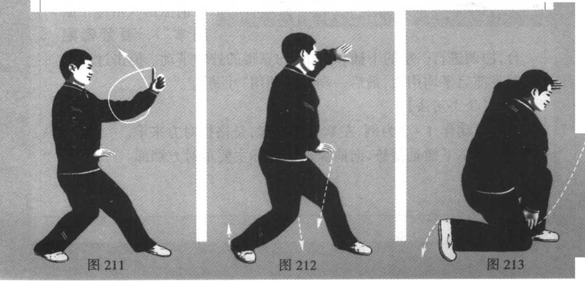 1. 左顺步三体势之后,(图211)左掌略收回,然后向右(掌心 向右)、向下(掌心向下)、向左划弧(掌心向左)架起。(图212)