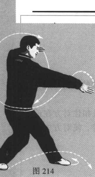 3. 腰向右拧,还原成左三体势步,与此同时,右掌(掌心向 右)以小指侧向前撩击。(图214)