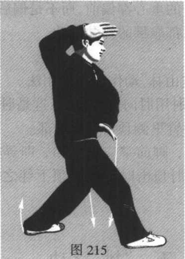4. 右掌略收回, 随后向左(掌心向 左)、向下(掌心向 下)、向右划弧(掌心 向右)架起;左掌按至 腹前;右脚上一步成 右三体势步。(图215)