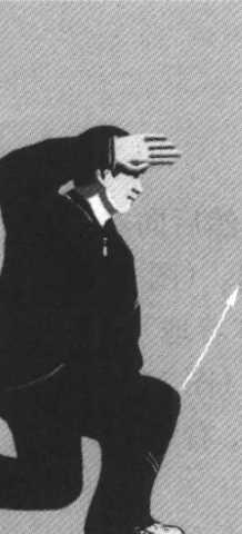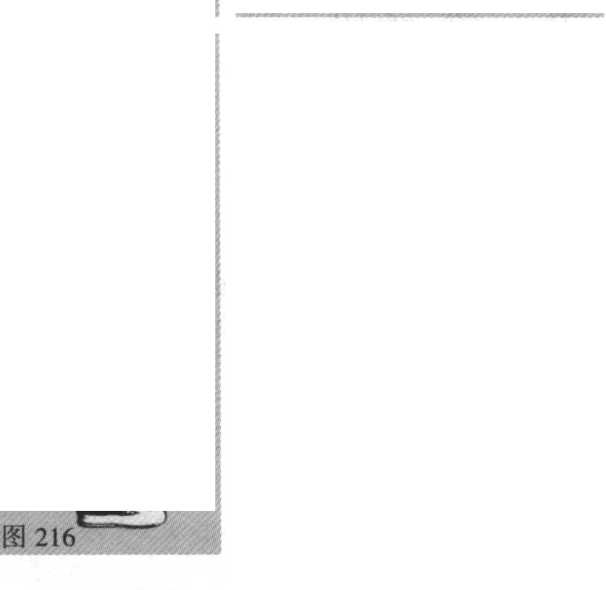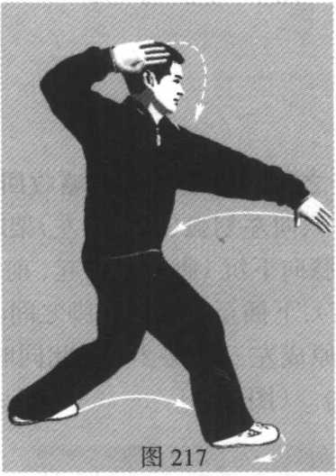 5. 腰向右拧,左 膝向下沉(脚后跟提 起、前掌着地),左掌 里旋(使掌心向左), 下插至左膝与右脚之 间。(图216)