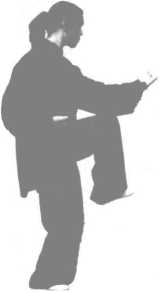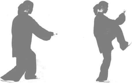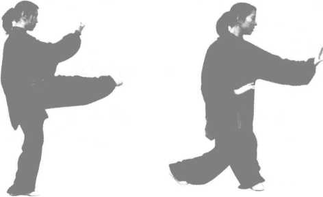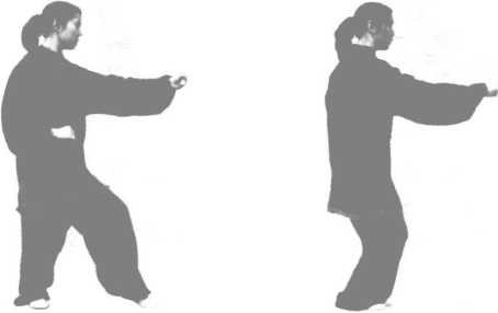 (1) 接上式,身体边起;同时,左脚向前进一小步,脚跟微离 地,重心放在右脚(图6-16)。