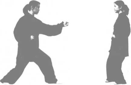 (1)接上式,左脚向后转180°,重心偏于左腿;两拳收于腰 际,拳心向上,目视前方(图6-19)。