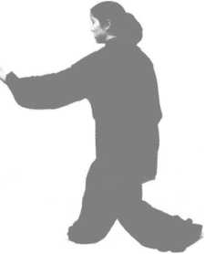仙人捋须:左脚向前一步;同时,两手从两侧伸出,与下颌同高 (图6 -22),两手从胸前往下捋到小腹部(图6 -23、图6-24)0