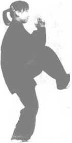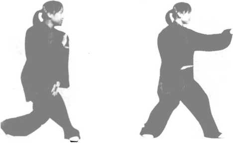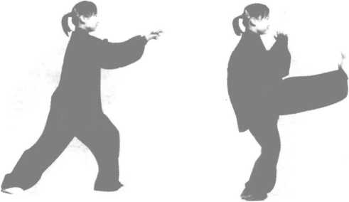 (2) 两手同时从两侧划弧至两肋,两手向上方捧出;同时,右 脚向前蹬出,与裆部同高(图6-66,图6-67)。