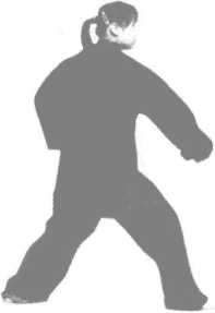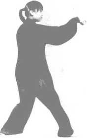 (1) 左脚外摆,右脚往 左进一步,回扣左脚旁成实 步,左脚成虚步;同时,转体 270。,两手划弧,缩身,右手 停在胸前,左手在右大腿前 (图 6-63)0