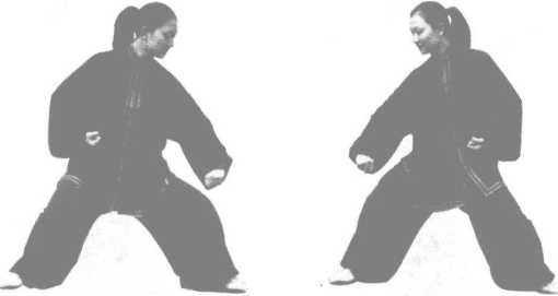 此功讲究劲力以冷、脆取人,捋人时双肩不可过脚,练习时臂 不过后,将敌捋至自己身前,下与膝相呼应。有腿踢法与之呼应, 是实践中取胜的先决条件。成混元桩站立,吸气两拳收于下腹 部,呼气左掌向前穿出;吸气抓拳向左后下方捋回,呼气右掌向 前穿出;吸气抓拳向右后下方捋回。按此方法练习,次数不限(图 3 -74、图 3 -75)o
