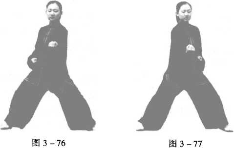 击,吸气收回,呼气右拳向前点出与敌接触部分为拳峰。按此方 法练习,次数不限(图3-76、图3-77)。