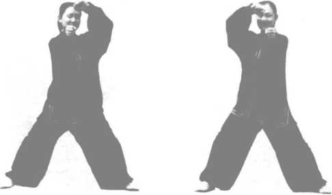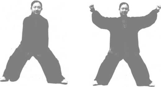 双拳顺肩下沉,拳心内扣,拳眼相向,双脚蹬地,猛然发力, 双臂向上向外张开,鼻内配呼“嗯”。此功大开大合,于伸缩之间 发力,可于猛然之间取敌,亦是锻炼人内脏的好方法。