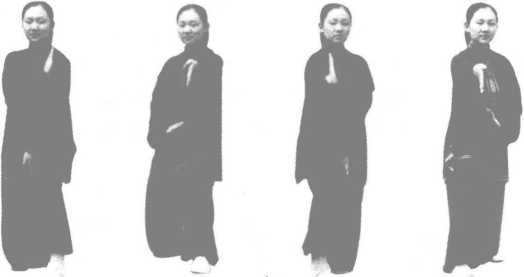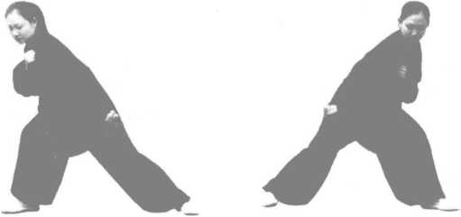 以左式为例,左脚内收点地立于右脚弯处,右掌立于左肩处 护脸与左肩平行,左掌向下、大拇指向前置于裆部,而后呼气猝 然发力向上,可击敌裆、腹、心脏等。此法系腰部之力贯于臂而 后发,全身之力同时爆发而击敌。