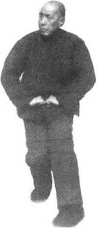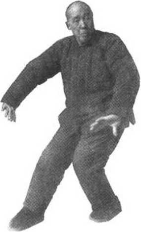 图 8-13以两脚相距一脚半为宜。双膝仍要保持屈曲,后腿膝盖距前腿弯 不超过6厘米(2寸)。走步用形意拳的瞠步,脚底与地面平行, 距地约1.5厘米(半寸)。迈步时,前腿曜,如行泥地,后脚蹬, 脚掌内侧用力,牵动肝经、脾经,取《内经》“肝脾之气宜升” 之意。前脚脚跟先着地,然后全脚着地。脚走双线,走步不要 快。全凭双脚、双膝用力。仍用胁呼吸法,提脚为吸,落脚为 呼,吸无意,呼有意。所走圈数多少不限。
