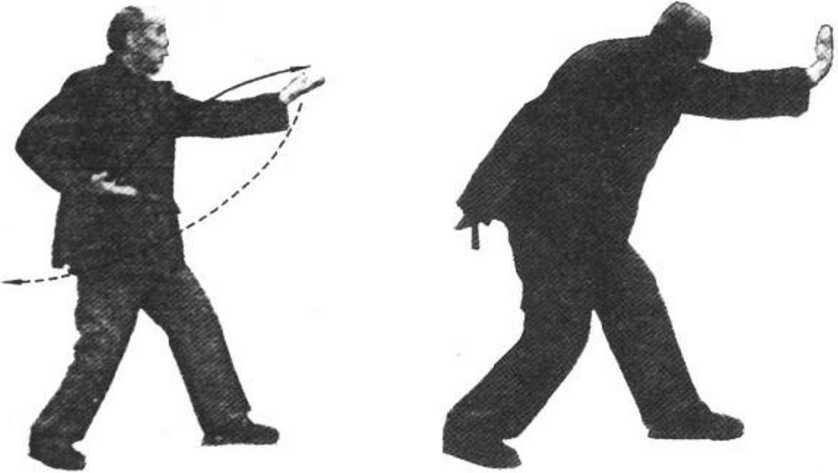 3 .右掌经左肘弯上向前推出,意念有向前推动大气之意。 推到极处,与左脚上下相顾,高与肩平,掌心向前,肘下屈有坠 劲;同时,左掌由体前方向下按,小臂内旋翻至掌心向下,经左 胯边往后塌劲,停于臀部后方约3分米(尺余)处,掌心朝上; 头由左向后转,转至脸向后为止,呼气一口(图9-7)。