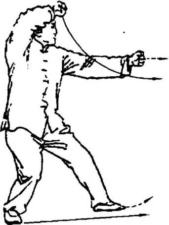 注意:左拳之向上拧翻、左拳之平直击出、左脚之进步与呼 气是同时的,必须完整一气。