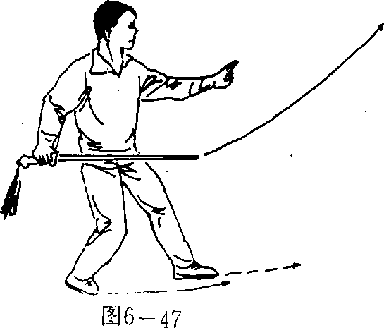 接上势,左脚向后落步;同时,以右脚脚掌为轴,身体向后 转,右手持剑随转体经头上向前劈出,随之后抽至右髓侧,剑 尖向前;左手剑指先附于右腕随剑前劈,右手后抽剑时,再顺 势向前伸指,指尖高与鼻平;目视剑尖(图6 — 47)。