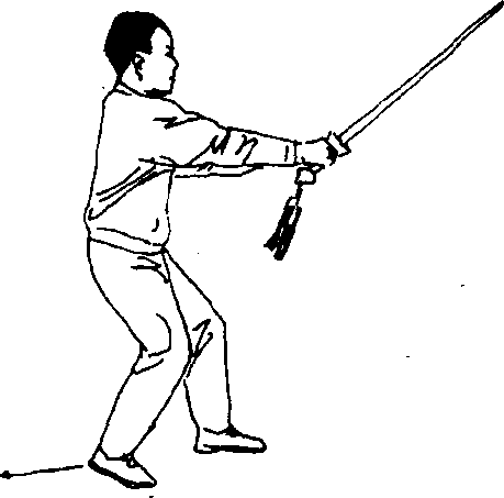 (一)接上势,右脚向前上一步;同时,右手持剑小臂外旋, 使剑身向身体右侧平刃下落,剑尖向右;左手剑指仍附于右 腕,目视前方(图6 — 45)。