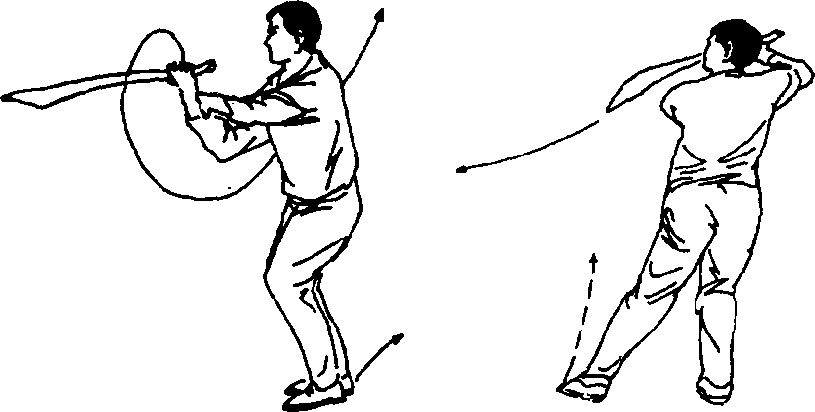(一)接上势,两腿姿势不变;右手持刀屈肘外旋,使刀身 纵向拧转,刀刃翻转向上,刀尖向前,高与鼻平;左掌随之下落 附于右小臂,掌心斜向下;目视刀尖(图7—36)。(二)接上动,右脚向右后方撤一步,左腿蹬直成侧弓步; 同时,上体向右拧转;右手持刀小臂内旋拧转,使刀身由前纵 向拧转至身体右侧架起,刀刃向上,刀尖向左前方;左掌附于 右腕随之运转;目视左前方(图7 — 37)。图7-36 图7 - 37要点:刀身要纵向拧转:架刀要力达刀刃中段。