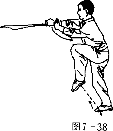 接上势,右腿直膝站起,左腿屈膝上提,脚尖上勾并内扣 成右独立步;同时,上体向左拧转;右手持刀向左斜前方反手 刺出,刀刃向上,刀尖向前,高与肩平;左掌附于右腕助力;目 视刀尖(图7 — 38)。要点:提膝与反刺刀要同时进行,力达刀尖。