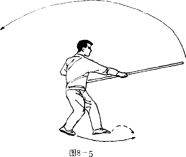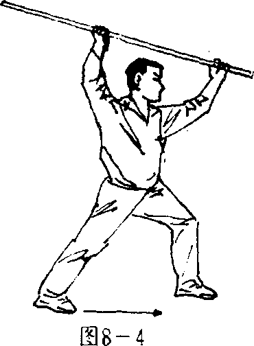 (一)接上势,左脚向前一步;同时,左手持棍把向左上方 抬举,右手位置不变;将棍梢摆至身后;头向左转;目视前方 (图 8 — 4) o(二)接上动,身体重心向前平移,右脚向前跟进半步成拗 三体式步;同时,上体向左拧转:双手持棍向前劈出,使棍梢由 后经上劈至身前,棍高略低于头;左手持棍把随之收至左腰 侧;目视棍梢(图8-5)。要 点:劈棍时要用左手拉右手推的合力,力达棍梢。
