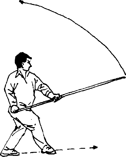 (一)接上势,身体向左转,左脚随之向前上一步,脚尖外 展,同时宁左手滑握棍身由前向上摆,右手持棍把随之自然前 摆,头向左转,平视前方(8—24)。