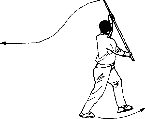 (二)接上动,身体继续向左转,右脚脚尖内扣向左脚内侧 并步;同时,左手滑握棍身向左绕摆,右手持棍把随之向左反 手戳出,使棍梢由上向左下落并戳至身体左侧,略高于肩,目 视棍梢(图8—25)。 .