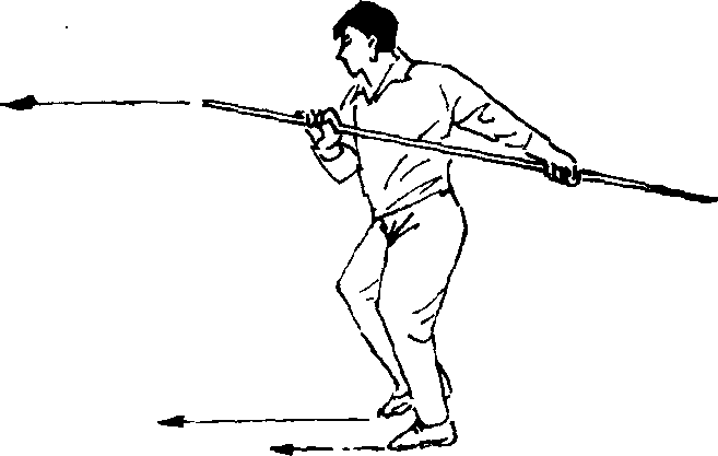 (二)接上动,右脚向前上一步,左脚随之跟进成顺三体式 步,同时,上体向左拧转,右手持棍把向前伸臂戳出,左手持棍 身随之屈臂内收,棍把戳出后高与肩平,目视棍把(图8 — 29)。