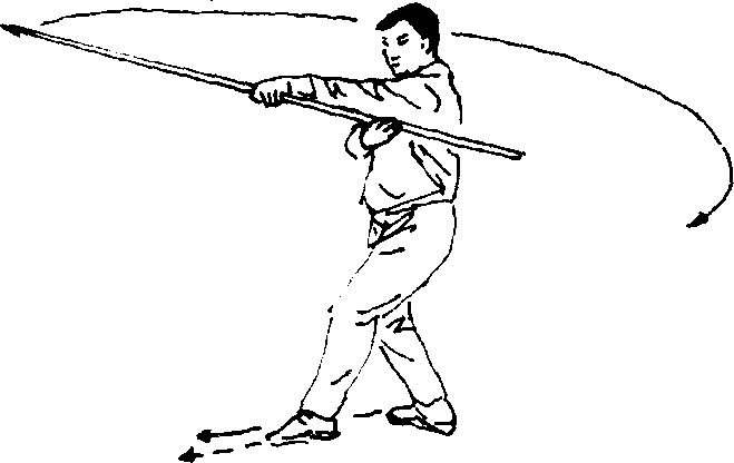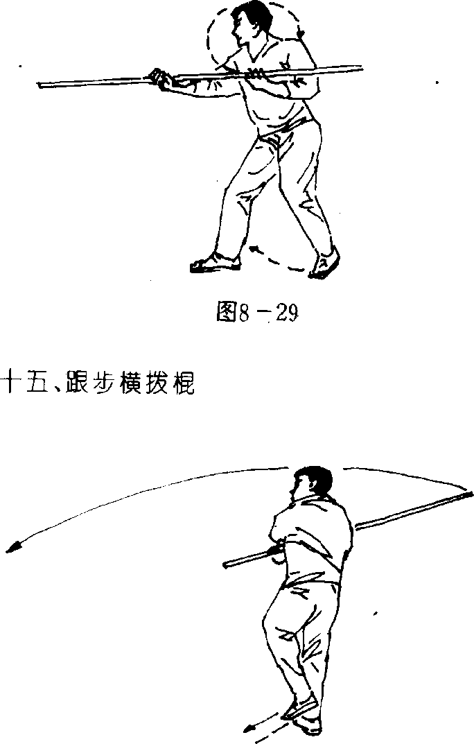 (一)接上势,左脚向前上半步,右脚随之跟进提收于左脚 内侧成磨胫步;同时,上体向左拧转,左手滑握棍身直臂向后 抡转,右手滑握棍把随之屈臂上举,使棍梢由前经上抡转向 后,棍把由后抡转向前,目视前方(图8 — 28)。