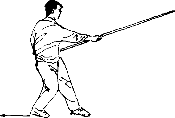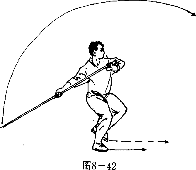 (一)接上势,右脚在左脚内侧下踏震脚,左脚随之提收于 右脚内侧;同时,头向左转,目视前方;两手持棍姿势不变(图 8—42)。(二)接上动,左脚向前上一步,右脚随之跟进成拗三体式 步;同时,上体向左拧转;双手持棍向前劈出,使棍梢由后经上? 179 ?劈至身前,高略低于头;左手持棍把随之收至左腰侧;目视棍 梢(图 8 — 43)。图8 —43要 点:震脚要沉稳有力;劈棍要力达棍梢。