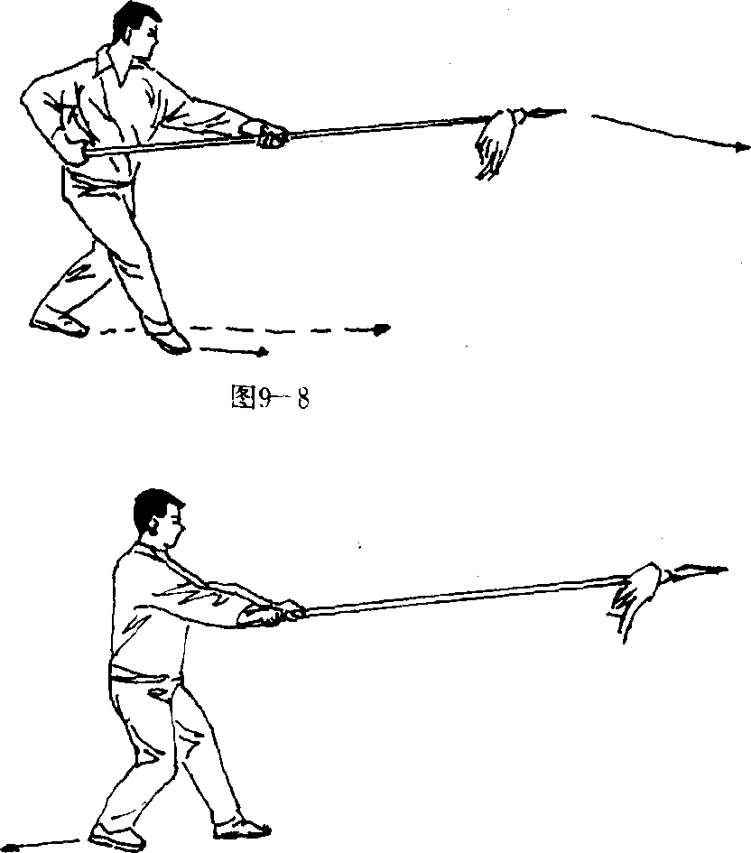 (三)接上动,左脚向前上一步,右脚随之跟进成拗三体式 步;同时,上体向左拧转;右手持枪向前扎出至碰左手,枪尖高 与肩平;目视枪尖(图9 — 9)。