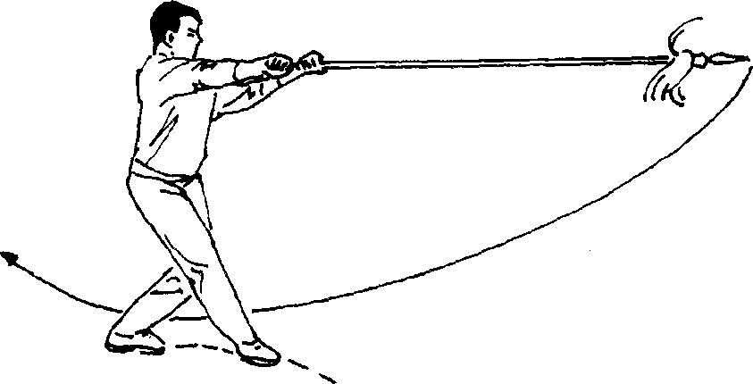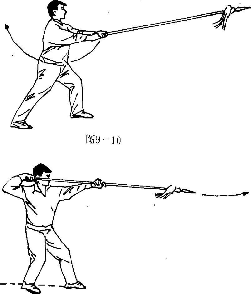 (一)接上势,上体及双手持枪姿势不变;右脚向后撤半 步;目视前方(图9-10)o图9 一 11(二)接上动,身体重心向后平移至右腿;同时,上体向右 拧转;右手持枪把向后抽拉,并向上摆提至头部右侧;左手松 握枪身随之略向上举;目视枪尖(图9— 11)。(三)接上动,右脚脚掌擦地向后退步,退至右脚后侧时脚 跟踏地完成退踏步;同时,右手持枪把反手向前扎至左手后, 枪尖高与肩平;目视枪尖(图9- 12)。、图9-12要 点:退踏步与反手扎枪要上下协调,力达枪尖。