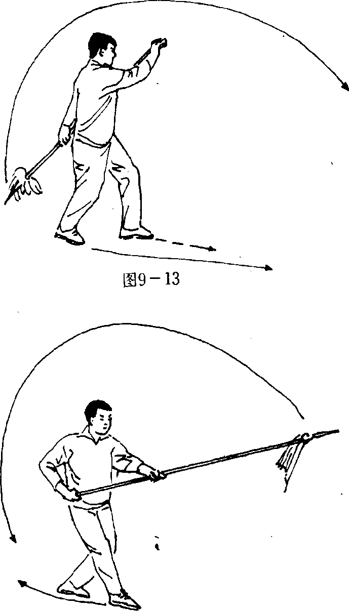 (一)接上势,左脚向右斜前方上一步;同时,上体向左拧 转:左手滑握枪身将枪尖由前经下摆至身后;右手持枪把随之 略向前上方提带;目视前方(图9— 13)。(二)接上动,右脚向前上一步,左脚随之向前跟进成拗三 体式步;同时,上体向右转;右手持枪把,左手滑握枪身将枪尖 由后经上劈至身前,枪尖高与鼻平;目视枪尖(图9一 14)。09-14要 点:抡转劈枪要连贯,力达枪身前段。