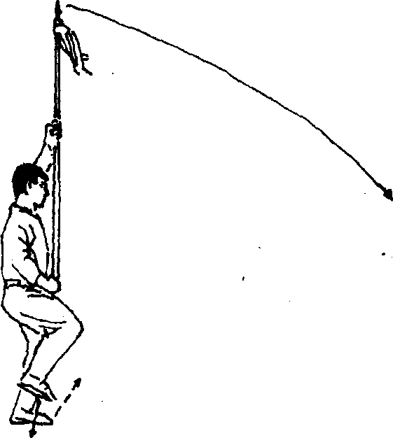 (一)接上势,右脚向后提收于左小腿内侧;同时,上体略 向左转;左手滑握枪身,右手下压枪把将枪尖由下经前上挑至 头顶上方;目视前方(图9-25).