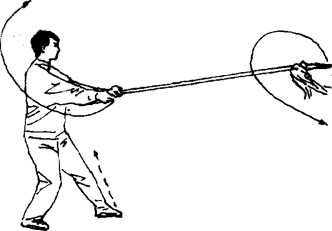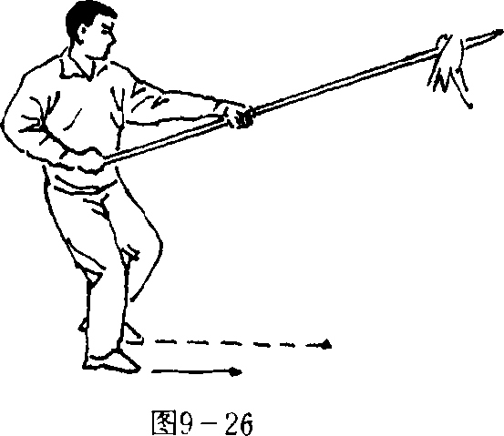 (三)接上动,左脚向前上一步,右脚随之跟进成拗三体式 步;同时,上体向左拧转;右手持枪向前扎出至碰左手,枪尖高 与肩平;目视枪尖(图9 — 27)。
