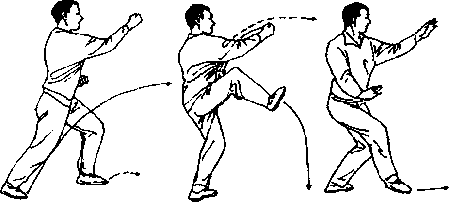 (二)接上动,上体及两臂姿势不变;右腿屈膝向前上方提 摆,脚尖外展;左脚顺势向前纵跳后落地;目视前方(图5- 20) o