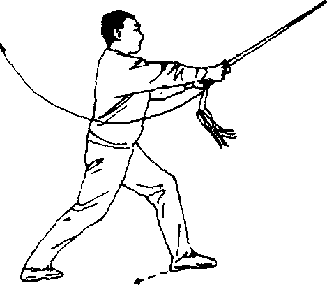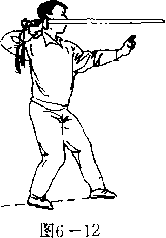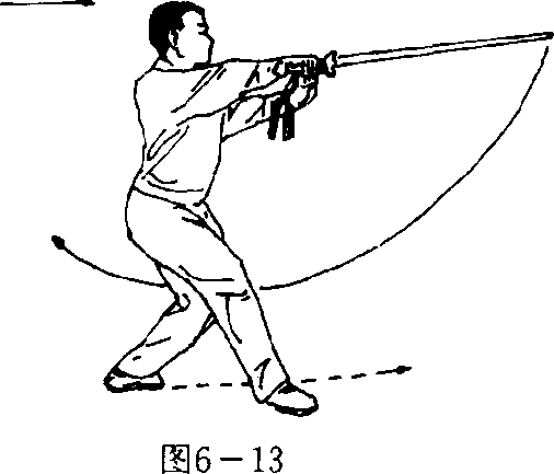 (三)接上动,左脚脚掌擦地继续向后退步,退至右脚后侧 时脚跟踏地完成退踏步;同时,上体向左拧转;右手持剑向前 反剌,至手臂自然伸直,剑尖高与肩平;左手剑指随之略向后 收附于右腕;目视剑尖(图6—13)。