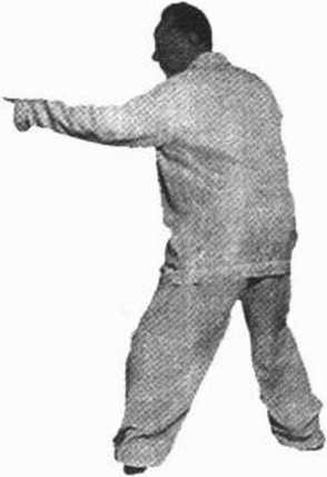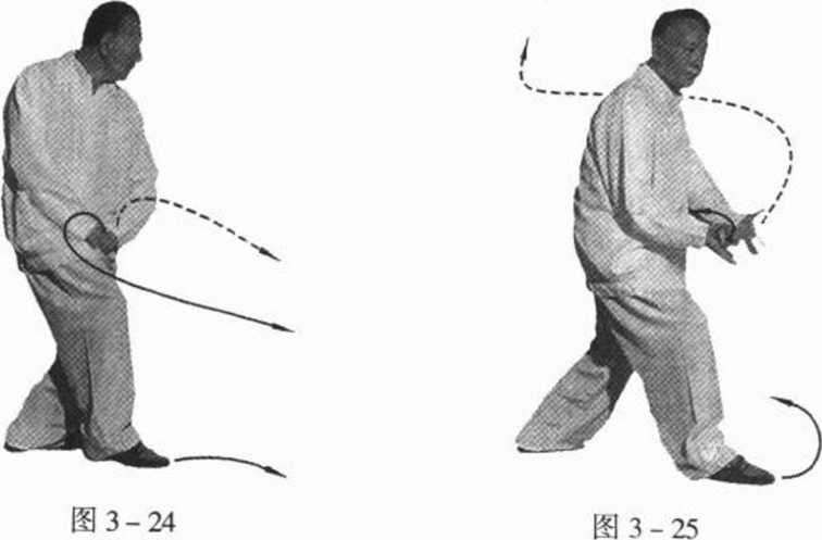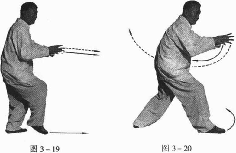 ③两手托出将至定点时,尾闾要向前收,丹田要沉而抱气, 以促使劲力的突发。