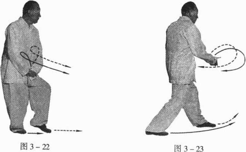 (1)由三体势,左足向回微收半步,足掌着地;同时,收左 手,并向回勾搂,两手置于腹前,成阴拳(图3-22)。