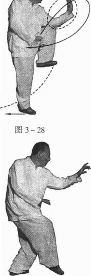图 3-29图 3-29(2)继上动,左足向前提起,膝高与腹齐;左手向前、向上 托起,掌心斜向上,四指斜向后上方,高与胫齐;同时,右手收 于脐前,成阳掌,目视前方(图3-28)。