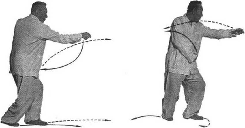 由三体势,左足向前垫进一足之远,右足也随之跟进半步, 落于左足之后约2分米(六七寸)处,左足为顺,右足为横,两 腿屈膝半蹲,重心落于右足;同时右手变拳,循上弧线经与左手 虎口处相磨,而后向前崩出,成立拳,高与心齐;左手向内勾 搂,循内弧线收至脐前,拳心向下;上体随之向左旋转90。,目 视右拳(图1-88)。